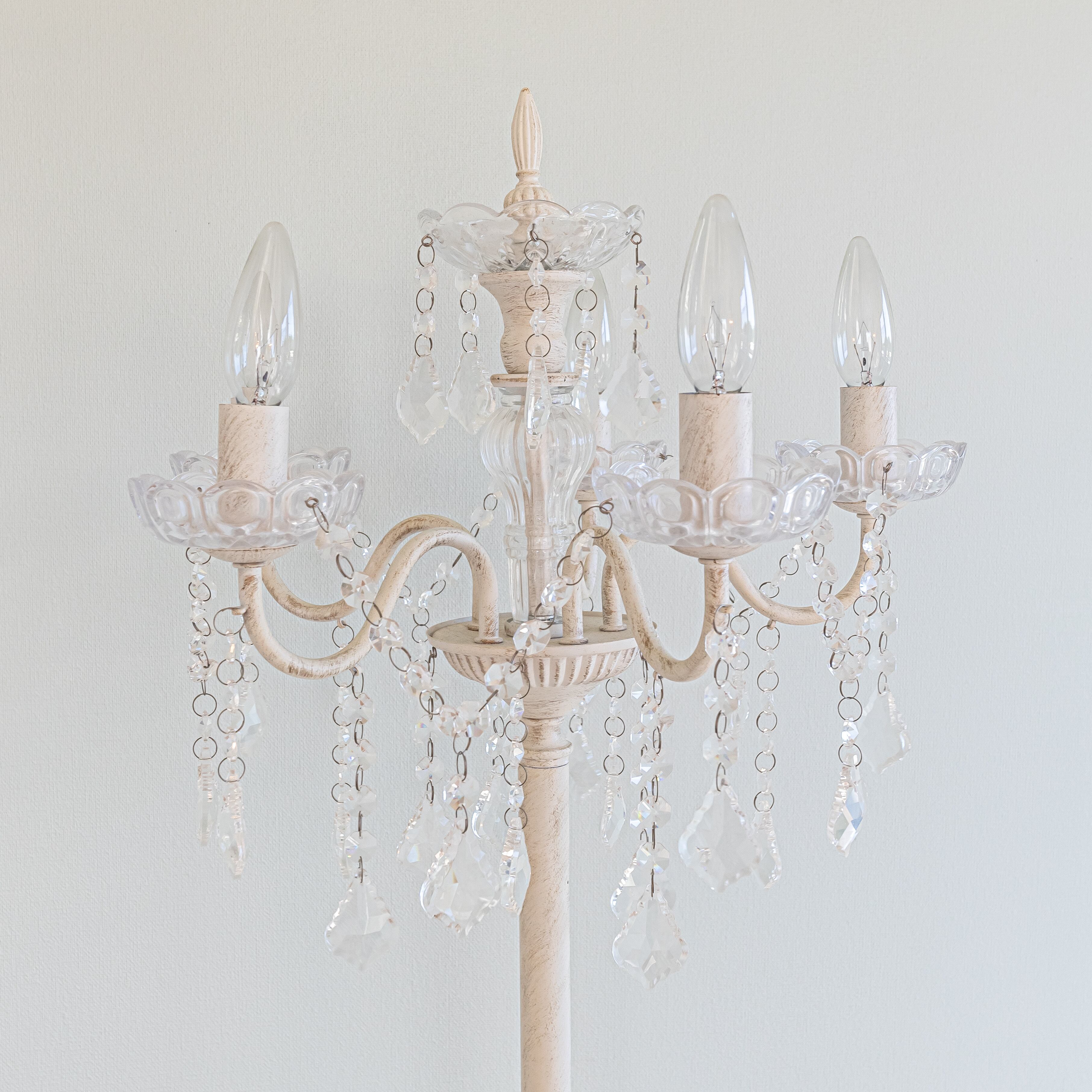 素材:ガラス&スチール サイズ:H1620×ø420mm 電球:E-17(5灯)白熱球40w スイッチ:中間スイッチ(ON/OFF) コード:約1800mm カラー:ホワイトアンティーク ※現在ホワイトアンティークのみの取扱いとさせて頂いてます